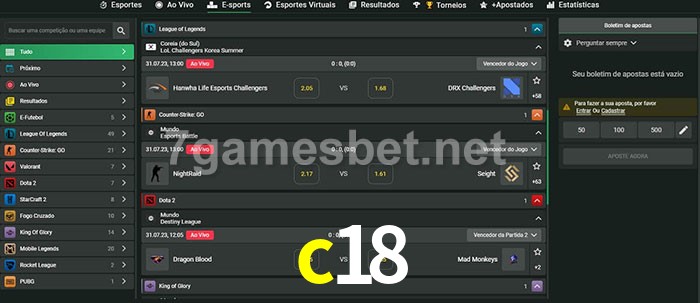 O c18 oferece uma grande seleção de opções de apostas em e-sports com probabilidades competitivas
